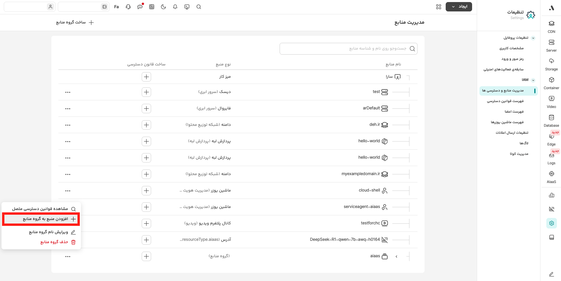 پس از اضافه شدن این گروه، روی (...) مقابل آن کلیک و «افزودن منبع به گروه منابع» را انتخاب کنید.
