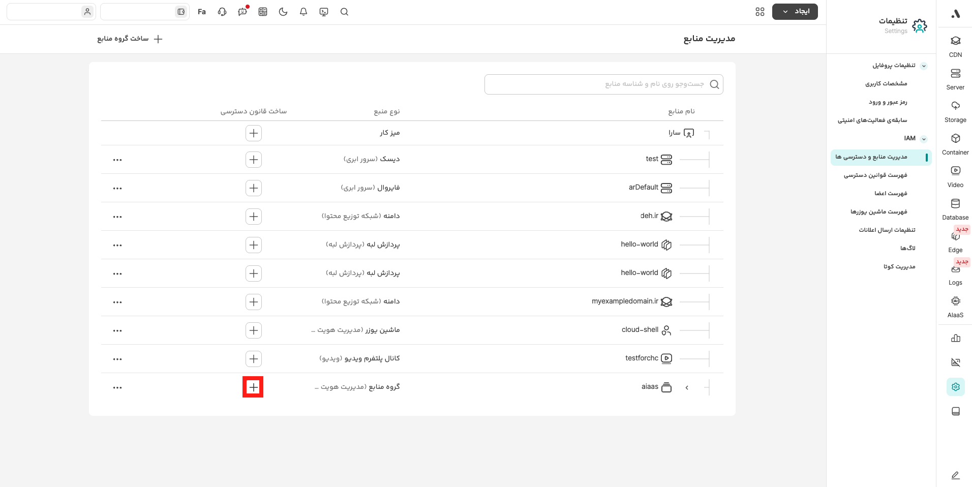 برای تعریف قانون دسترسی روی یک گروه از منابع، وارد بخش مدیریت منابع شوید و روی دکمه‌ی «افزودن قانون» مقابل گروه منابع مورد نظرتان کلیک کنید.