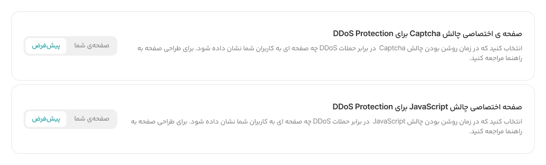 با فعال سازی یکی از چالشهای JS یا Captcha صفحهای به بازدیدکنندگان سایت شما نمایش داده میشود تا ربات نبودن کاربر را تشخیص دهد. به کمک قابلیت صفحات اختصاصی، امکان شخصیسازی کردن این صفحات برایتان فراهم میشود.