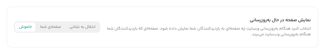 با این ویژگی میتوانید انتخاب کنید که هنگام بهروزرسانی وبسایت چه صفحهای به بازدیدکنندگان شما نمایش داده شود. به بیان دیگر صفحهای که بازدیدکنندگان شما هنگام بهروزرسانی وبسایت میبینند در این فیلد قابل تنظیم است.