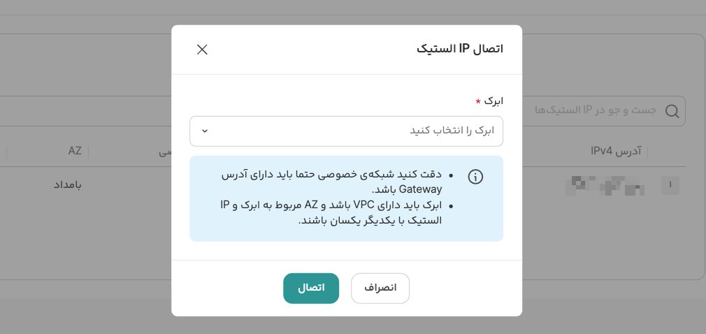 ۴. ابرک مورد نظر را انتخاب کرده و Elastic IP را به آن متصل کنید.