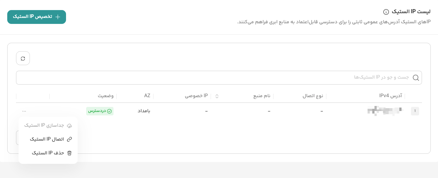 ۳. پس از ساخت ، از منوی مقابل آن در لیست Elastic IPها، گزینهی «اتصال IP الستیک» را انتخاب کنید.