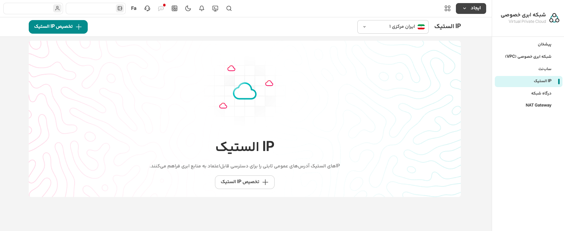 برای تخصیص Elastic IP در پنل کاربری آروانکلاد وارد بخش VPC شوید و از منوی سمت راست، «IP الستیک» را انتخاب کنید.