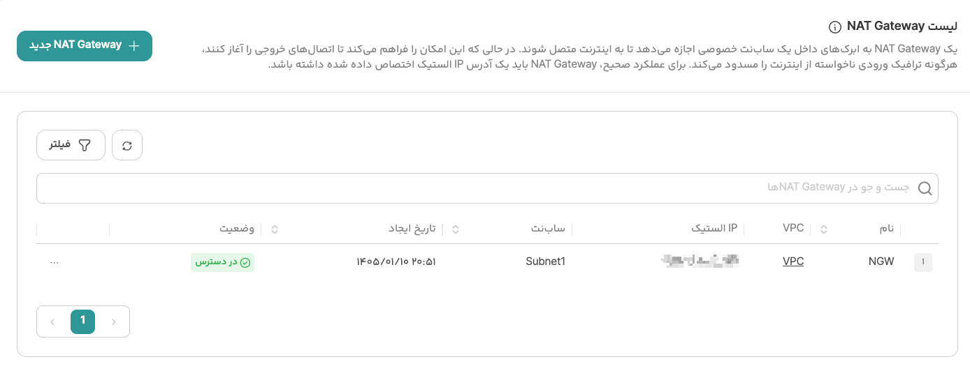- NAT Gateway باید در یکی از Subnetهای VPC شما ساخته شود. ترافیک خروجی از این Subnet از طریق NAT Gateway به اینترنت هدایت خواهد شد.