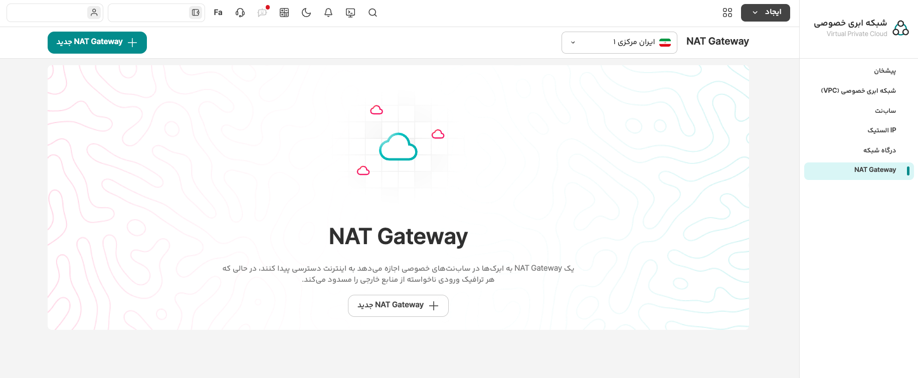 در پنل کاربری آروانکلاد وارد بخش VPC شوید و از منوی سمت راست، «NAT Gateway» را انتخاب کنید.
